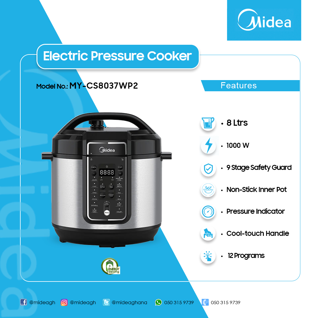 The Midea MY-CS6037WP2 Electric Pressure Cooker is a modern kitchen appliance designed to provide convenience, efficiency, and versatility in food preparation. Manufactured by Midea, a well-known brand in home appliances, this electric pressure cooker is suitable for both small and large households due to its generous capacity of approximately 8 Liters The appliance operates on a power output of 1000 watts and uses a standard voltage of 220–240V, ensuring fast and efficient cooking. It is equipped with 12 preset cooking programs, allowing users to prepare a wide variety of meals such as rice, soup, meat, and beans with ease. These automated functions reduce the need for constant monitoring, making cooking more convenient and time-saving. In addition, the cooker features three adjustable pressure levels—low, medium, and high—giving users greater control over how their meals are prepared. It also includes a digital LED display panel that makes operation simple and user-friendly. The built-in timer supports up to 24-hour delay start and allows cooking times to be adjusted between 1 minute and 8 hours, offering flexibility for different recipes. The inner pot of the cooker is made with a non-stick coating, which ensures even heat distribution and makes cleaning easy after use. Its silver exterior gives it a sleek and modern appearance that fits well in any kitchen setting. Safety is a key feature of the Midea MY-CS6037WP2. It is designed with a 9-stage safety protection system, including lid locking, pressure control, and over-pressure protection, ensuring safe operation at all times. Additionally, the cooker includes a keep-warm function, which helps maintain the temperature of food after cooking. In conclusion, the Midea MY-CS6037WP2 Electric Pressure Cooker is a reliable and efficient appliance that combines advanced features with ease of use. Its multiple cooking functions, safety systems, and durable design make it an excellent choice for modern cooking needs.