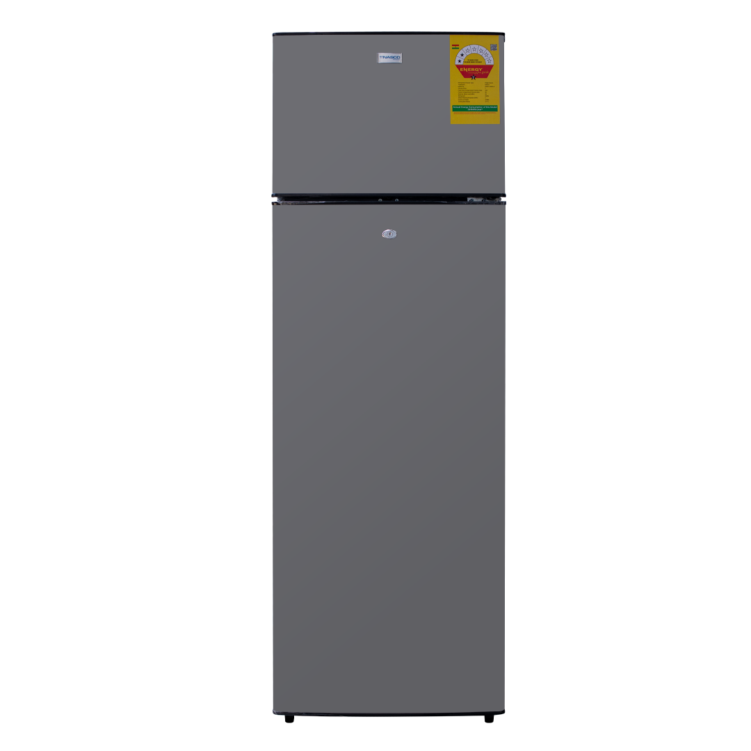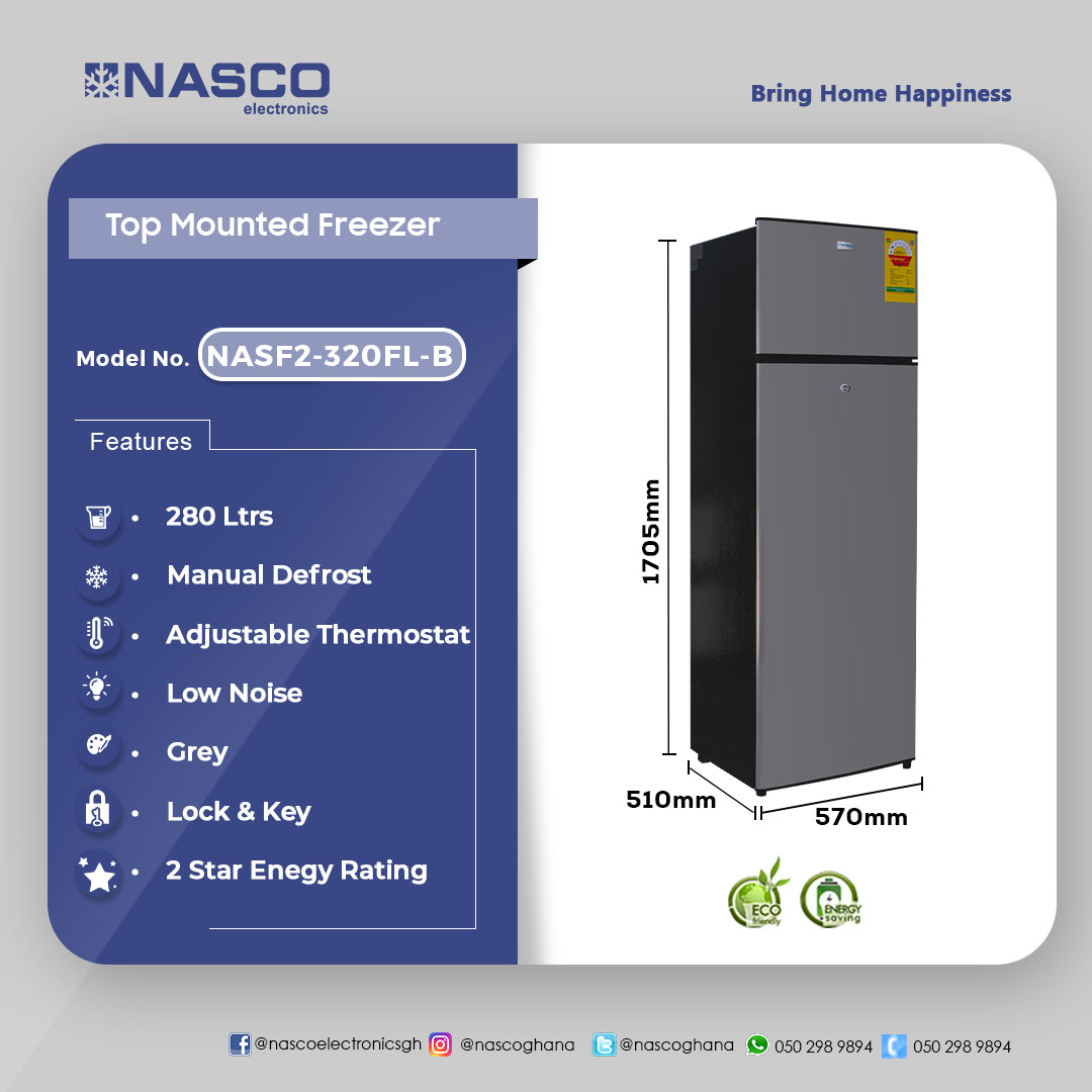 The NASF2-320FL-B refrigerator is a practical and energy-efficient appliance designed to meet the everyday cooling needs of households and small offices. Manufactured by Nasco, this model is known for its durability, simple design, and reliable performance. With a total storage capacity of approximately 280 liters, the NASF2-320FL-B provides sufficient space for storing both fresh and frozen food items. It features a top freezer design, which separates frozen goods from refrigerated items, allowing for better organization and easy access. This layout is particularly convenient for users who frequently use the freezer section. The refrigerator operates using a manual defrost cooling system, which ensures consistent cooling performance. Although it requires occasional defrosting, this system is energy-efficient and helps maintain stable internal temperatures. The appliance is also equipped with an adjustable thermostat, allowing users to control the temperature according to their storage needs. In terms of energy efficiency, the NASF2-320FL-B has an approximate 2-star energy rating, making it a cost-effective option for daily use. It uses an eco-friendly, CFC-free refrigerant, which reduces environmental impact while maintaining effective cooling performance. The internal structure includes multiple storage shelves and compartments that enhance organization. It also features interior lighting, which improves visibility, especially at night. Additionally, some variants come with a built-in water dispenser, adding convenience for users who need quick access to chilled water. The refrigerator operates with low noise, making it suitable for homes, offices, and other quiet environments. Its sleek silver finish gives it a modern and attractive appearance that blends well with most kitchen designs. In conclusion, the NASF2-320FL-B refrigerator is a reliable and efficient appliance that combines essential features with user-friendly operation. Its moderate capacity, energy efficiency, and practical design make it an ideal choice for individuals and families seeking an affordable and dependable refrigeration solution.