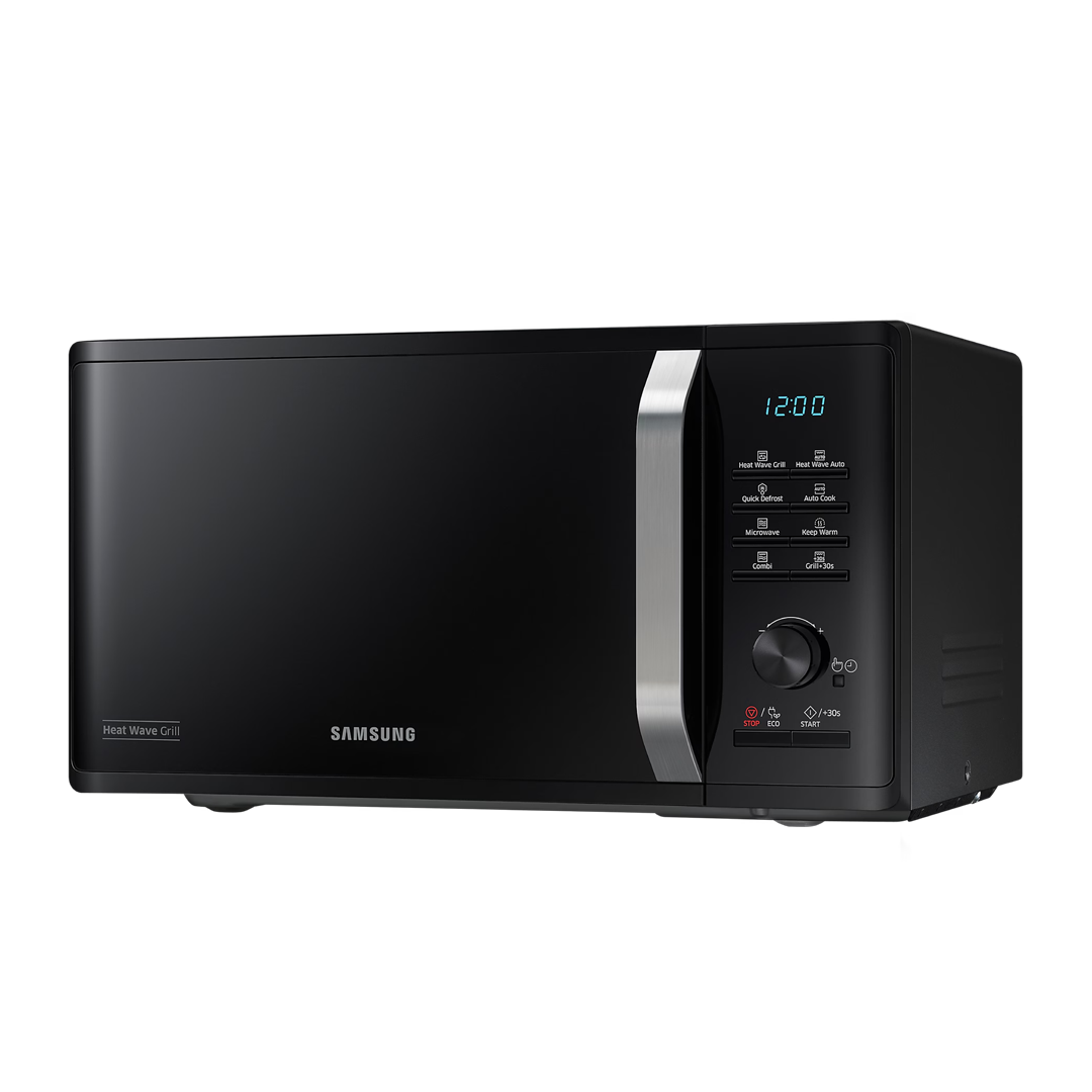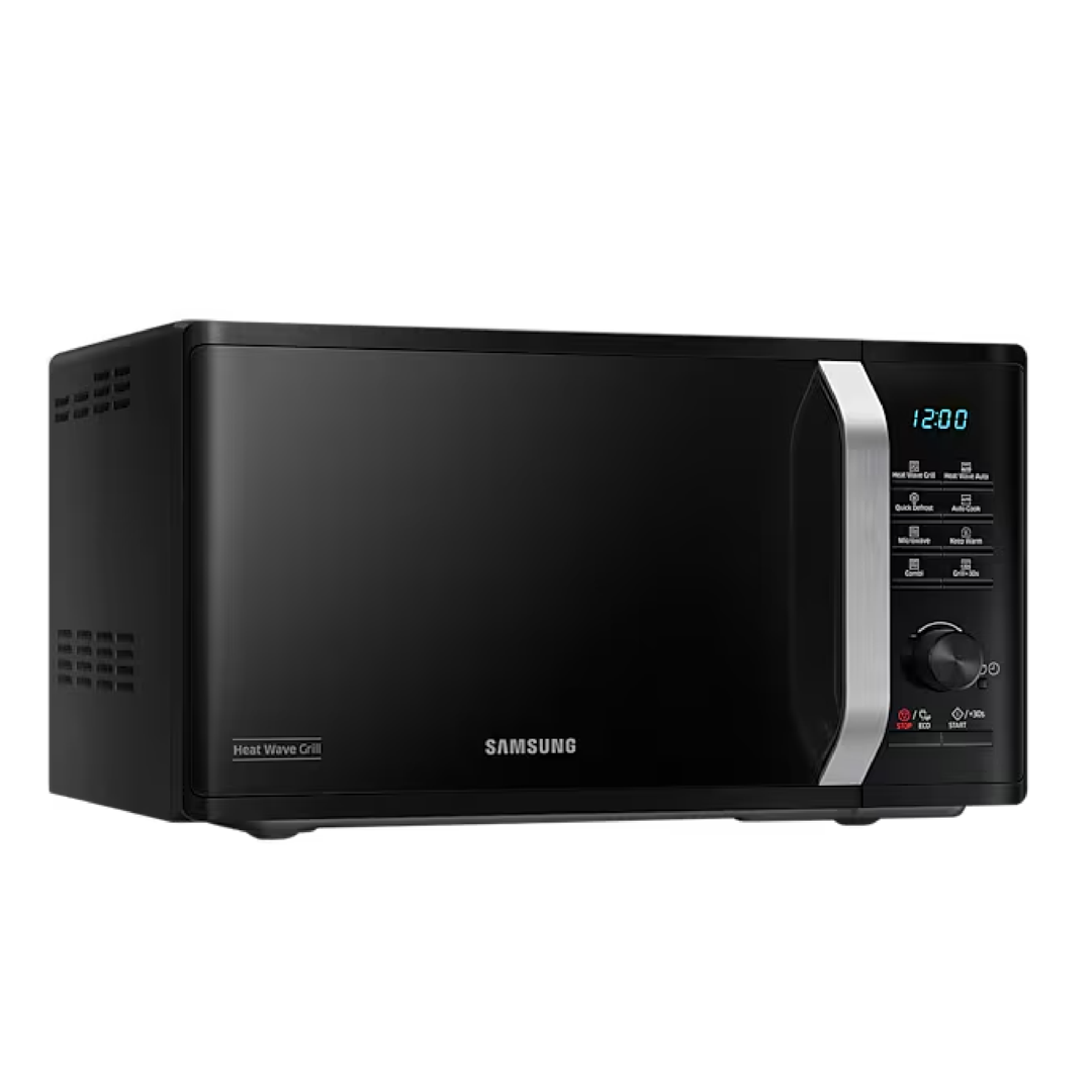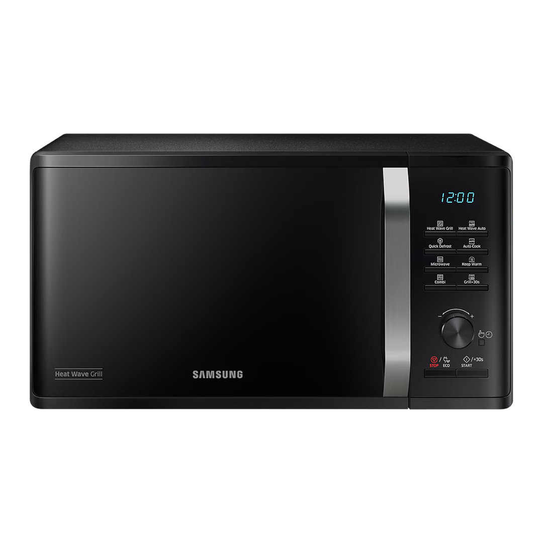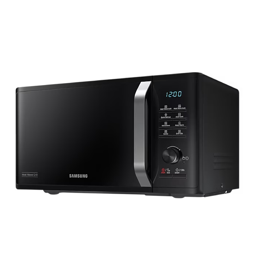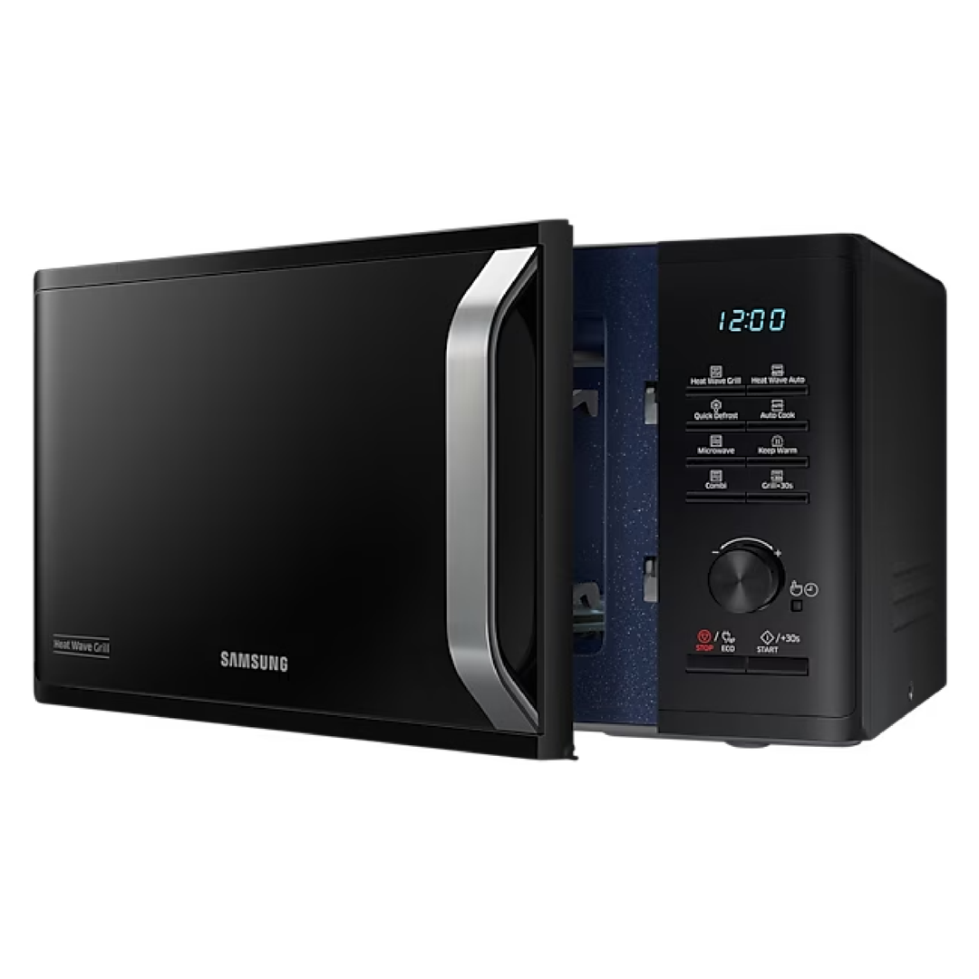 The Samsung MG23K3575AK-EU is a sleek and powerful 23 litre countertop microwave with integrated grill functionality, enhanced by Samsung’s Heat Wave Grill system. This innovative Triangulated Heat Technology—incorporating a grill, heat reflector, and fan—ensures rapid and uniform cooking, giving you beautifully grilled results every time. The Samsung MG23K3575AK-EU is a versatile 23 L-temperature-controlled countertop microwave that combines efficient microwaving with a high-powered grill. It features the advanced Heat Wave Grill system, utilizing Triangulated Heat Technology—a combination of a grill element, heat reflector, and fan to distribute heat evenly and cook food quickly.