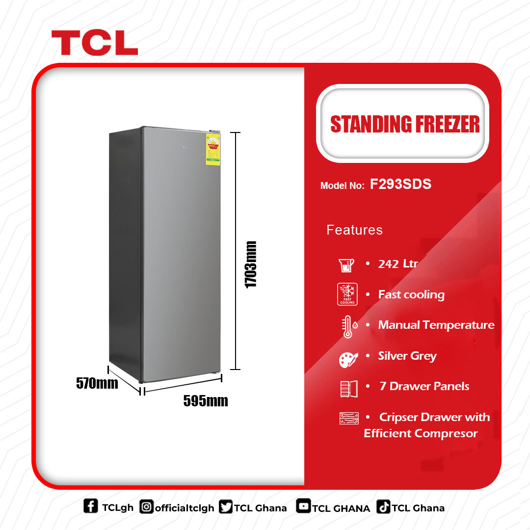 The TCL F293SDS is a 242 litre upright freezer designed to offer reliable cold storage with a large capacity in a space-efficient footprint. Engineered for both domestic and commercial use, it provides powerful freezing performance combined with easy organisation through its drawer layout.Automatically prevents ice buildup, eliminating the need for manual defrosting and allowing for consistent performance and efficiency. The freezer door can be installed to open from either the left or right side, offering installation flexibility.