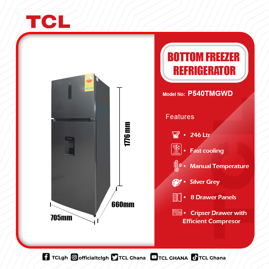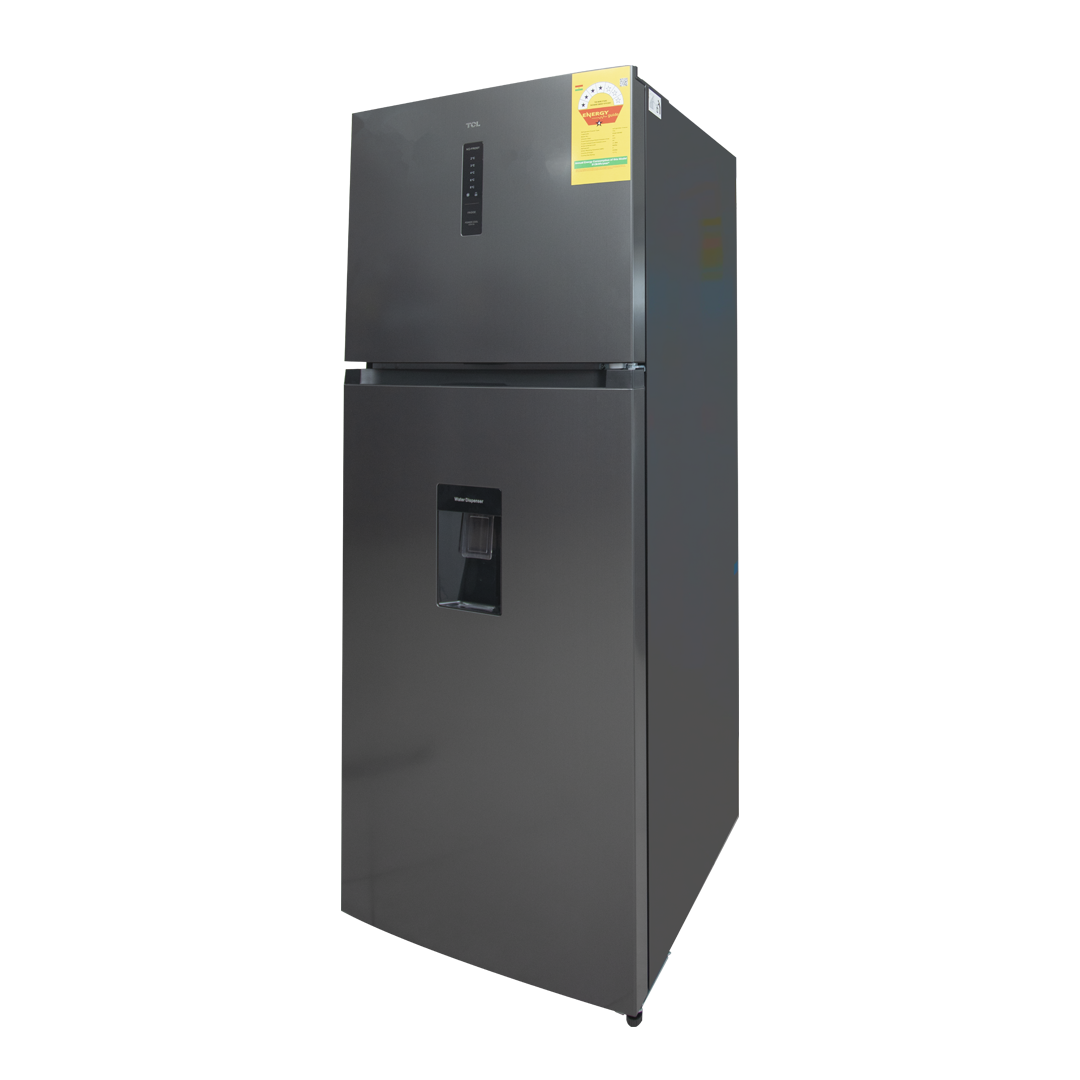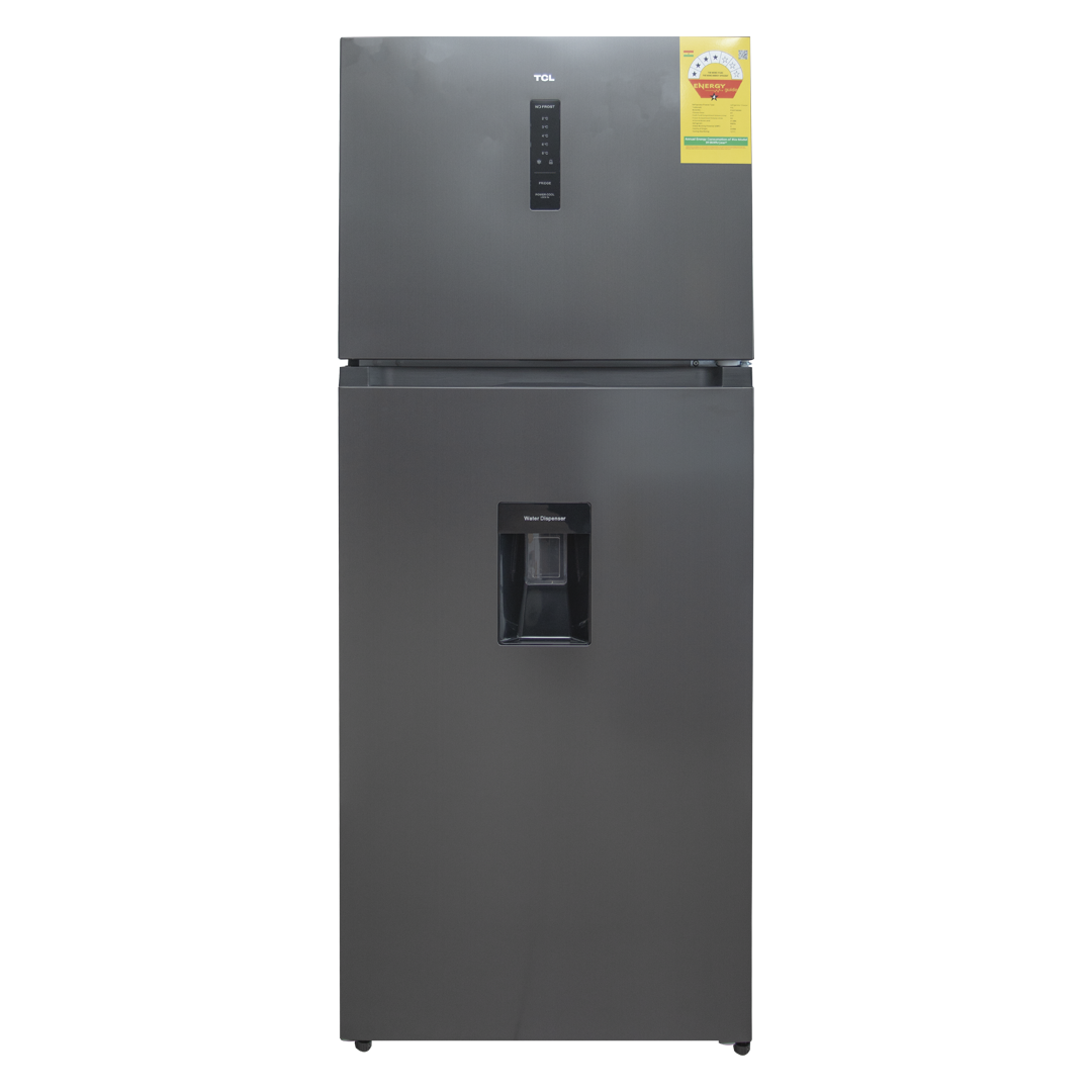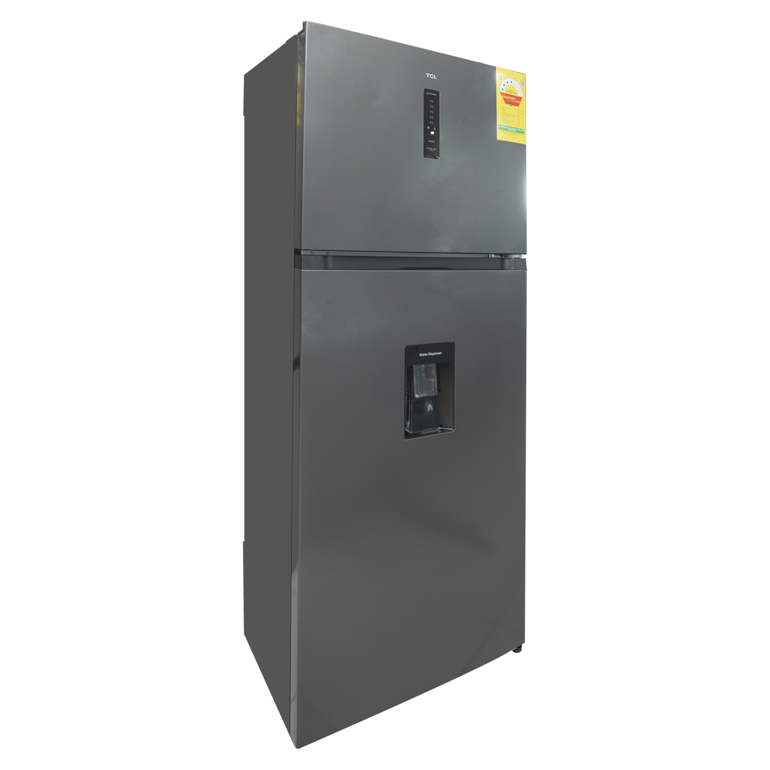 The TCL P540TMGWD is a large 413-litre top-mount refrigerator designed for modern family kitchens, featuring a Total No Frost system that eliminates manual defrosting, a powerful multi-airflow cooling system for consistent temperature circulation, a built-in front water dispenser for easy access to chilled drinking water, an electronic digital control panel with modes such as Holiday and Power Cool for efficient operation, a 4-star energy efficiency rating that helps reduce electricity consumption, spacious interior storage including tempered-glass adjustable shelves, a humidity-controlled fruit and vegetable crisper, dedicated door storage for 2-litre bottles, and a fresh food compartment for everyday items, all housed in a stylish stainless inox finish with LED interior lighting, reversible doors for flexible installation, and a tall, space-efficient design that provides reliable cooling performance with low maintenance and high convenience for daily use.